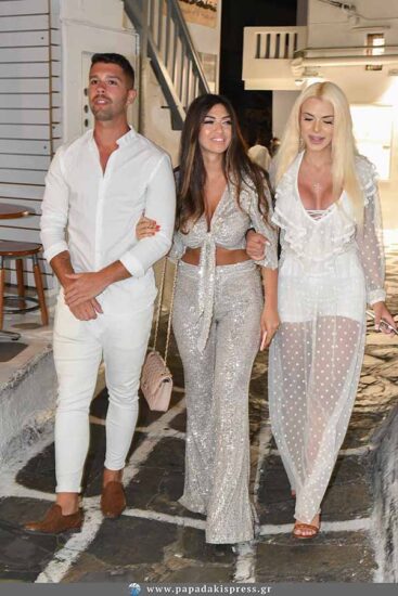 Μαζί της στο νησί των ανέμων, βρέθηκαν και οι πρώην συμπαίκτες της Κυριακή Τσανικίδη και Σωκράτης Ελ Γκαμαλί, οι οποίοι αποτελούν ένα πολύ αγαπημένο ζευγάρι. Τους τρεις τούς συναντήσαμε να περπατούν στα στενά της Μυκόνου και έδειχναν να περνούν καλά και να είναι χαλαροί κι ευδιάθετοι.