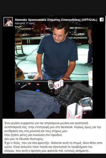 «Ένα μεγάλο ευχαριστώ για την απρόσμενα μεγάλη και αγαπητική ανταπόκρισή σας, στην επιστροφή μου στο facebook. Κυρίως όμως για την αντίδρασή σας στη μουσική και τους στίχους μου. Μου ζητάτε φέτος μία συναυλία στο Ηρώδειο. Δεν μου το έδωσαν δυστυχώς. Έχει ο Θεός, που για όλα φροντίζει. Φαίνεται αυτή τη στιγμή, άλλο θέλει από εμένα. Είναι άλλωστε τόσο πολλά και εξοντωτικά τα προβλήματα του κόσμου, που αυτή η άρνηση μου φαίνεται πιά, εντελώς ασήμαντη. Θα ήθελα να μπορούσα να μιλήσω σε καθέναν από εσάς προσωπικά, για την μουσική, την πίστη την Ελλάδα, να ακούσω τα προβλήματά σας και να γελάσω με τ’ αστεία σας. Μην μπορώντας να κάνω αυτό, ελπίζω ότι με τη μουσική, τη στάση μου και τα λόγια μου, σας επιβεβαιώνω αυτό που ήδη ξέρετε. Ότι τελικά η αγκαλιά του Χριστού, είναι ο μόνος αξιόλογος και αληθινός προορισμός, αλλά και ο αδαπάνητος πλούτος, που αξίζει να αποκτάμε κάθε μέρα. Το έχω κι’ εγώ πολλές φορές ξεχάσει, στην, Μετά Χριστόν, ζωή μου και πέφτω και σηκώνομαι και “Πάλι απ’ την αρχή. Και πάλι ευχαριστώ για όλα και συνεχίστε να μου γράφετε. Μου αρέσει». έγραψε ο Σταμάτης Σπανουδάκης στη λεζάντα της φωτογραφίας που δημοσίευσε στα social media.