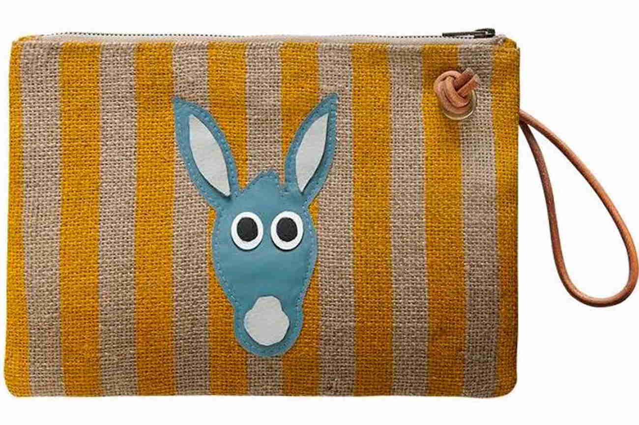 Ο designer Κωνσταντίνος Βαρβιτσιώτης πειραματίζεται επίσης και με τις πρώτες ύλες. Τα τρία αγαπημένα prints, το Μάτι, το Καρπούζι και ο Γάιδαρος, ράβονται πάνω σε clutches από φυσικό καμβά, με μπλε, μαύρες και φωτεινές κίτρινες ρίγες και λουρί από δέρμα, για all day, summer chic εμφανίσεις.