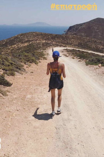 Την Πάτμο «οργώνει» η Τζένη Μπαλατσινού, η οποία έχει επιδοθεί σε πεζοπορία προκειμένου να ανακαλύψει κρυφές γωνιές του νησιού.