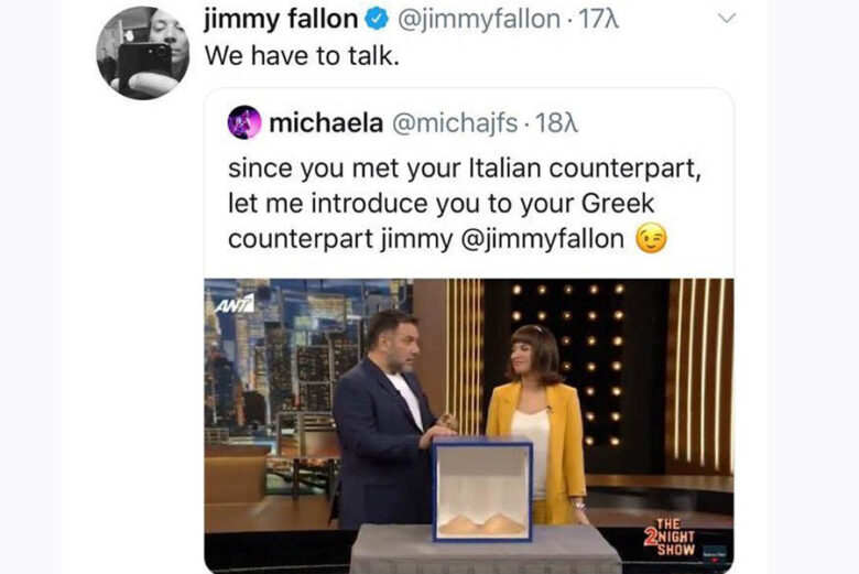 Ο διάσημος παρουσιαστής, έκανε repost φωτογραφία με τον Αρναούτογλου, σε αναφορά που γινόταν στο προφίλ του για τις αντιγραφές της εκπομπής του σε παγκόσμιο επίπεδο. Ως γνωστόν, ο Έλληνας παρουσιαστής έχει δανειστεί στοιχεία από την εκπομπή του Αμερικανού συναδέλφου του, κάτι που επισημάνθηκε από follower του Jimmy Falon ο οποίος και ανέβασε σχετική φωτογραφία στο Instagram του, με την επισήμανση: «Αφού συναντήσατε τον ιταλικό ομόλογό σας, επιτρέψτε μου να σας συστήσω στον Έλληνα».