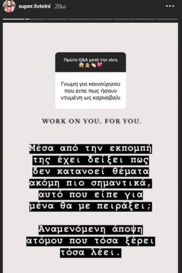 Η νικήτρια του My Style Rocks, δε φάνηκε να πτοείται ή να επηρεάζεται από το χαρακτηρισμό της παρουσιάστριας και όταν follower της τη ρώτησε πως αντιδρά σε αυτό, προτίμησε να δώσει μια απάντηση μέσα από τα stories της στο instagram. Εκεί έκανε μια ανάρτηση με την οποία πέταγε το «καρφί» της στην Κατερίνα Καινούργιου.