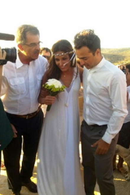 Η ηθοποιός φορούσε ένα λιτό, λευκό φόρεμα ενώ ο γαμπρός ένα λευκό πουκάμισο και γκρι παντελόνι.