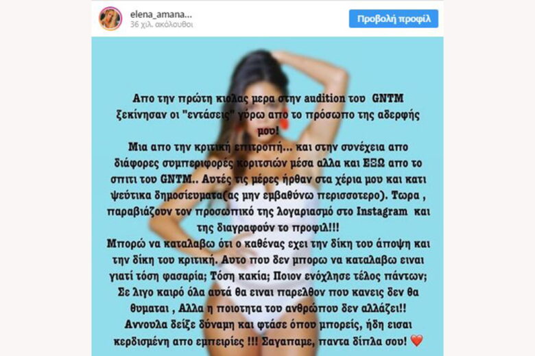 «Από την πρώτη κιόλας μέρα στην audition του GNTM ξεκίνησαν οι “εντάσεις” γύρω από το πρόσωπο της αδερφής μου! Μια από την κριτική επιτροπή… και στη συνέχεια από διάφορες συμπεριφορές κοριτσιών μέσα αλλά και ΕΞΩ από το σπίτι του GNTM. Αυτές τις μέρες ήρθαν στα χέρια μου και κάτι ψεύτικα δημοσιεύματα (ας μην εμβαθύνω περισσότερο). Τώρα, παραβιάζουν τον προσωπικό της λογαριασμό στο Instagram και της διαγράφουν το προφίλ. Μπορώ να καταλάβω ότι ο καθένας έχει τη δική του άποψη και τη δική του κριτική. Αυτό που δεν μπορώ να καταλάβω είναι γιατί τόση φασαρία; Τόση κακία; Ποιον ενόχλησε τέλος πάντων; Σε λίγο καιρό όλα αυτά θα είναι παρελθόν που κανείς δεν θα θυμάται. Αλλά η ποιότητα του ανθρώπου δεν αλλάζει!! Αννούλα δείξε δύναμη και φτάσε όπου μπορείς, ήδη είσαι κερδισμένη από εμπειρίες!!! Σ’ αγαπάμε, πάντα δίπλα σου», έγραψε η Έλενα Αμανατίδου πάνω σε μια φωτογραφία της αδερφής της ενώ στη λεζάντα συμπλήρωσε «Για όσους ψάχνουν και δεν βρίσκουν το προφίλ της Άννας».