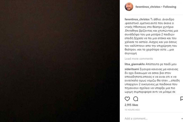 «Τι άθλιο ,άνανδρο ,φασιστικό ,εμετικό, αυτό που έκανε ο νταής Ηθοποιός στο θέατρο χυτήριο .Επιτέθηκε βρίζοντας και χτυπώντας μια συνάδελφο του μια μητέρα 2 παιδιών επειδή ξέχασε να πει μια ατάκα και του χάλασε το αστείο. Αίσχος και για όσους τον καλύπτουν από την επιχείρηση του θεάτρου και το χειρότερο ούτε ….μια συγνώμη» έγραψε ο Χρήστος Φερεντίνος στο προφίλ του στο Instagram.