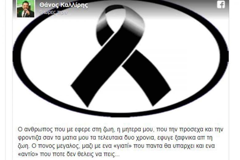 «Ο άνθρωπος που με έφερε στη ζωή, η μητέρα μου, που την πρόσεχα και την φρόντιζα σαν τα μάτια μου τα τελευταία δυο χρόνια, έφυγε ξαφνικά απ τη ζωή. Ο πόνος μεγάλος, μαζί με ένα «γιατί» που πάντα θα υπάρχει και ένα «αντίο» που ποτέ δεν θέλεις να πεις…» έγραψε o Θάνος Καλλίρης στο προφίλ του.