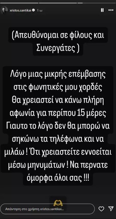 «Λόγω μιας μικρής επέμβασης στις φωνητικές μου χορδές θα χρειαστεί να κάνω πλήρη αφωνία για περίπου 15 μέρες Γι’ αυτό το λόγο δεν θα μπορώ να σηκώνω τα τηλέφωνα και να μιλάω! Ότι χρειαστείτε εννοείται μέσω μηνυμάτων! Να περνάτε όμορφα όλοι σας», έγραψε ο Χρήστος Σαντικάι.