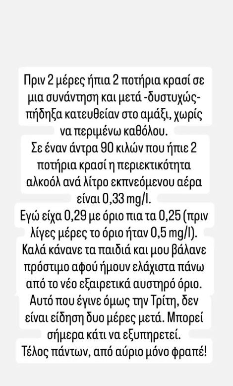 Εγώ είχα 0,29 με όριο πια τα 0,25 (πριν λίγες μέρες το όριο ήταν 0,5 mg/l). Καλά κάνανε τα παιδιά και μου βάλανε πρόστιμο αφού ήμουν ελάχιστα πάνω από το νέο εξαιρετικά αυστηρό όριο. Αυτό που έγινε όμως την Τρίτη δεν είναι είδηση 2 ημέρες μετά. Μπορεί σήμερα κάτι να εξυπηρετεί. Τέλος πάντων, από αύριο μόνο φραπέ», έγραψε o Διαμαντής Καραναστάσης στο Instagram του.