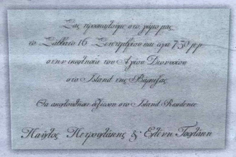 «Σας προσκαλούμε στον γάμο μας, το Σάββατο 16 Σεπτεμβρίου και ώρα 7:30μ.μ στην εκκλησία του Αγίου Διονυσίου στο Island της Βάρκιζας. Θα ακολουθήσει δεξίωση. Παύλος Πετρουλάκης & Ελένη Τσολάκη» αναφέρεται στο προσκλητήριο του ζευγαριού.