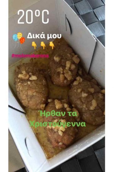 Η Ελεονώρα ανέβασε στα insta stories της μία φωτογραφία με τα μελομακάρονα που απόλαυσε, γράφοντας με χιούμορ στη λεζάντα: «Δικά μου…Ήρθαν τα Χριστούγεννα».