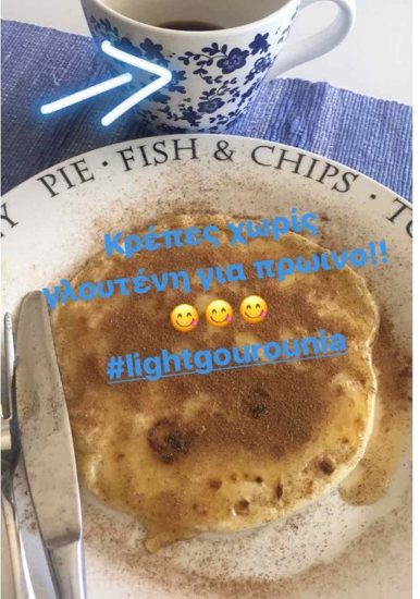 H Έλλη μέσα από τα insta stories του Instagram μας αποκάλυψε το πρωινό της γεύμα, το οποίο περιλάμβανε κρέπα χωρίς γλουτένη, την οποία συνδύασε με μέλι. “light γουρουνιά” έγραψε η τραγουδίστρια στη φωτογραφία που μοιράστηκε με τους διαδικτυακούς της φίλους.