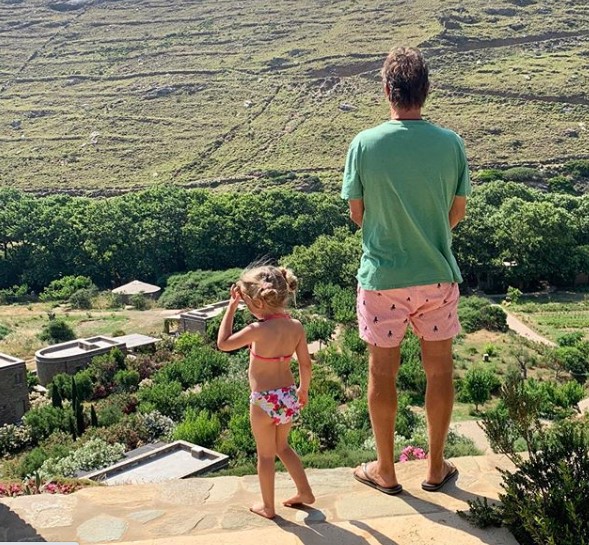 Η Ελένη Μενεγάκη φωτογράφησε τον αγαπημένο της Μάκη Παντζόπουλο, μαζί με την κόρη τους, Μαρίνα με την πλάτη στον φακό και φόντο ένα τοπίο της Άνδρου