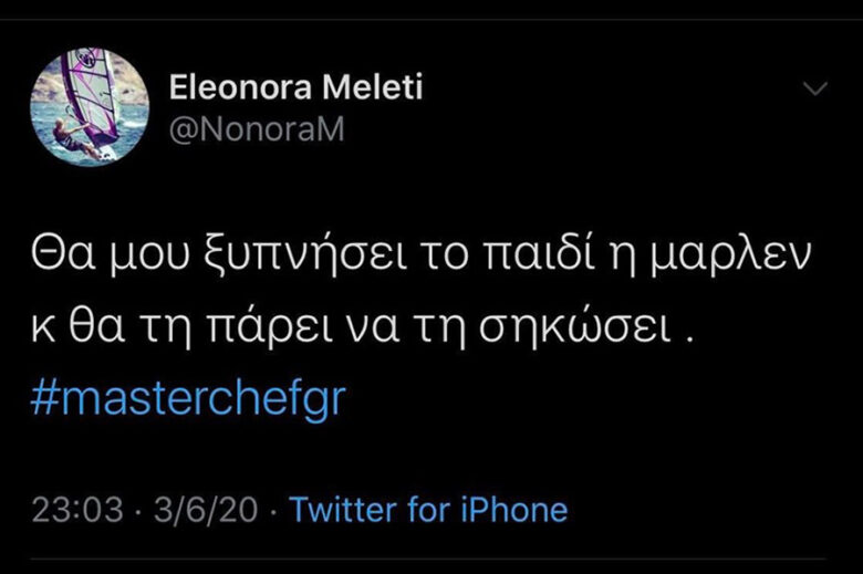 Μια πάντως από τους τηλεθεατές που δεν άντεξαν τις φωνές της Μάρλεν, ήταν και η Ελεονώρα Μελέτη και μάλιστα το εξέφρασε διαδικτυακά. Με ένα tweet της η παρουσιάστρια, σχολίασε το γεγονός με χιουμοριστικό πάντως τρόπο: «Θα μου ξυπνήσει το παιδί η Μάρλεν και θα την πάρει να τη σηκώσει».
