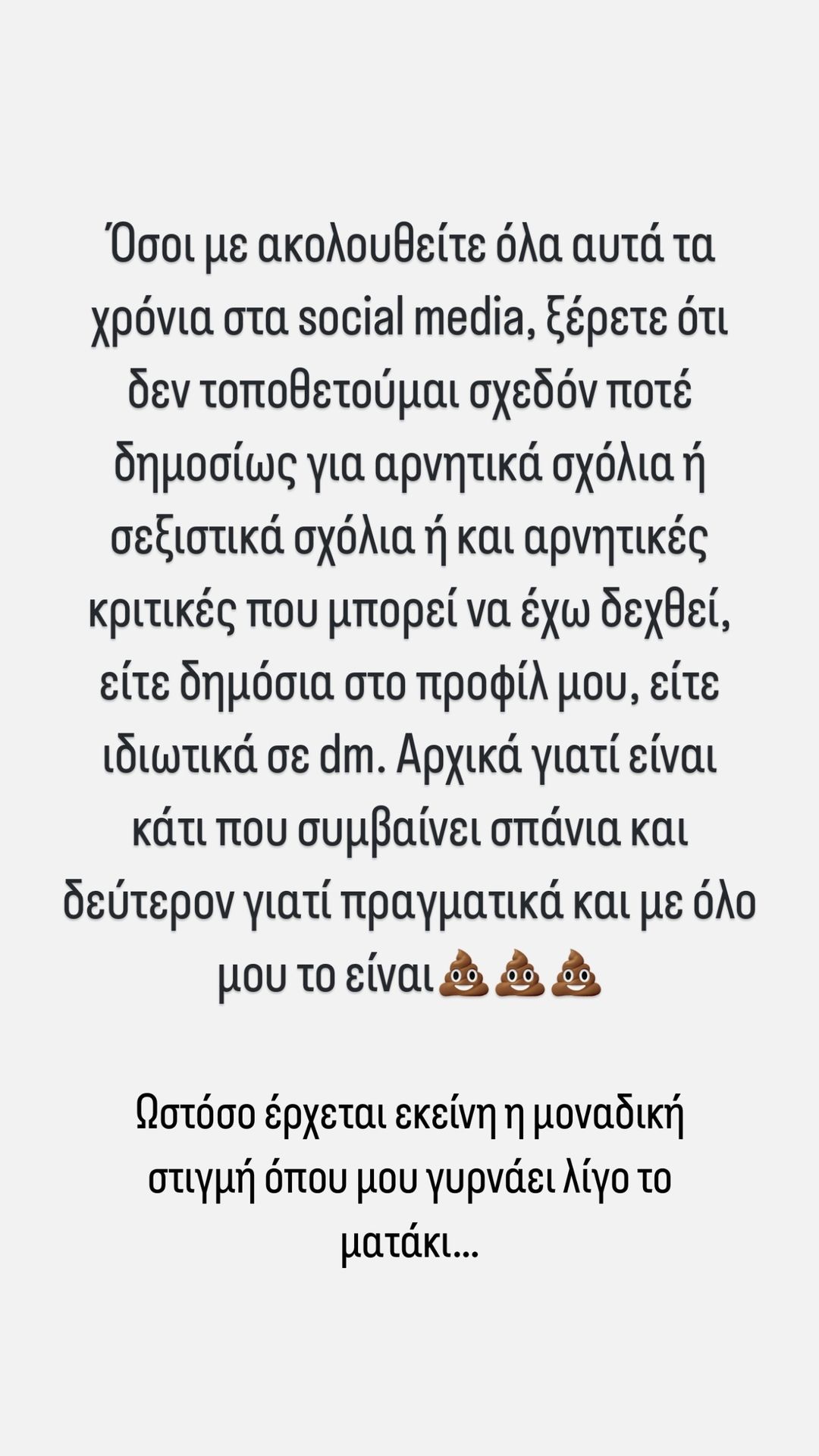 Η Νικολέττα Ράλλη δημοσίευσε μια σειρά από Instagram Stories, όπου ξέσπασε για τα άσεμνα μηνύματα που δέχεται…«Όσοι με ακολουθείτε όλα αυτά τα χρόνια στα social media, ξέρετε ότι δεν τοποθετούμε σχεδόν ποτέ δημοσίως για αρνητικά σχόλια ή σεξιστικά σχόλια ή και αρνητικές κριτικές που μπορεί να έχω δεχτεί, είτε δημόσια στο προφίλ μου είτε ιδιωτικά σε dm. Αρχικά γιατί είναι κάτι που συμβαίνει σπάνια και δεύτερον γιατί πραγματικά και με όλο μου το είναι χ@@ηκα. Ωστόσο έρχεται εκείνη μοναδική στιγμή που μου γυρνάει λίγο το ματάκι…