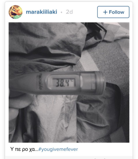 Ξεκίνησε η αντίστροφη μέτρηση για την τηλεοπτική επιστροφή του Νίκου Μουτσινά και της Μαρίας Ηλιάκη στον Alpha, η οποία έχει προγραμματιστεί για την Δευτέρα 3 Οκτωβρίου 2016. Στο μεταξύ όμως, η Μαρία Ηλιάκη ταλαιπωρείται από μια ίωση με συνέπεια να ανεβάσει πυρετό. Όπως είδαμε στην φωτογραφία που η ξανθιά παρουσιάστρια δημοσίευσε στο προσωπικό της account στο Instagram, το θερμόμετρο της έδειξε 38,4 και η ίδια θέλησε να σχολιάσει χιουμοριστικά «υπέροχα».