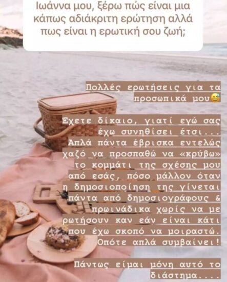 «Πολλές ερωτήσεις για τα προσωπικά μου… Έχετε δίκαιο, γιατί εγώ σας έχω συνηθίσει έτσι… Απλά πάντα έβρισκα εντελώς χαζό να προσπαθώ να «κρύβω» το κομμάτι της σχέσης μου από εσάς, πόσο μάλλον όταν η δημοσιοποίηση της γίνεται πάντα από δημοσιογράφους και πρωινάδικα χωρίς να με ρωτήσουν καν εάν είναι κάτι που έχω σκοπό να μοιραστώ. Οπότε απλά συμβαίνει! Πάντως είμαι μόνη αυτό το διάστημα…»