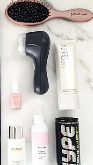 Έτσι λοιπόν, μια αντιηλιακή κρέμα με δείκτη προστασίας 30, ένα σπρέυ προσώπου με ροδόνερο, μια βούρτα μαλλιών κατασκευασμένη από τη δική σειρά περιποίησης, βερνίκι νυχιών σε ανοιχτή ροζ απόχρωση, μια μηχανική βούρτσα απολέπισης προσώπου, γάλα καρύδας για βαθύ καθαρισμό της επιδερμίδας αλλά και μια κρέμα που βοηθάει στον καλύτερο σχηματιμό των φρυδιών είναι τα μικρά μυστικά της Kim Kardashian για να μένει πάντα φρέσκια και λαμπερή…