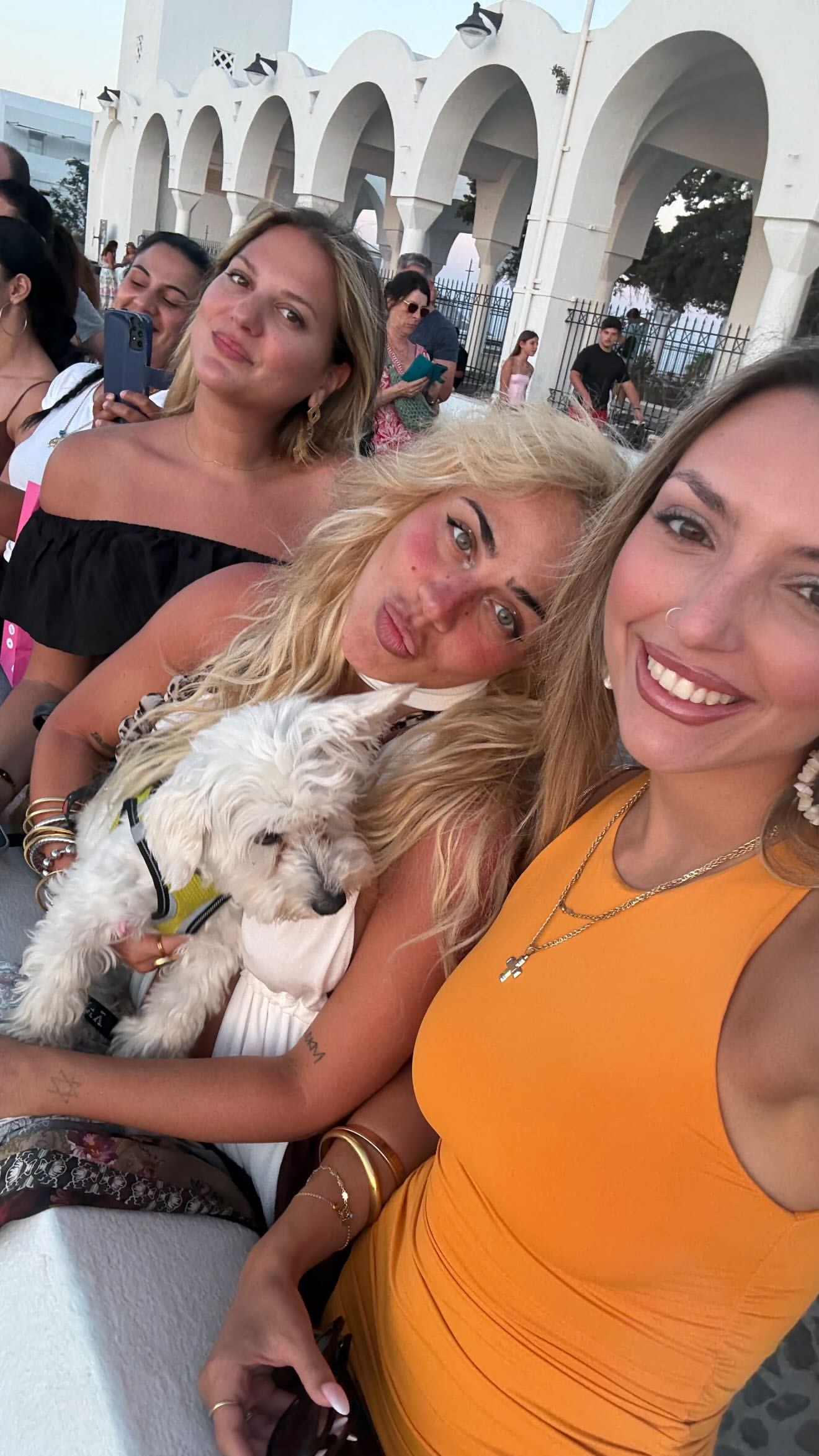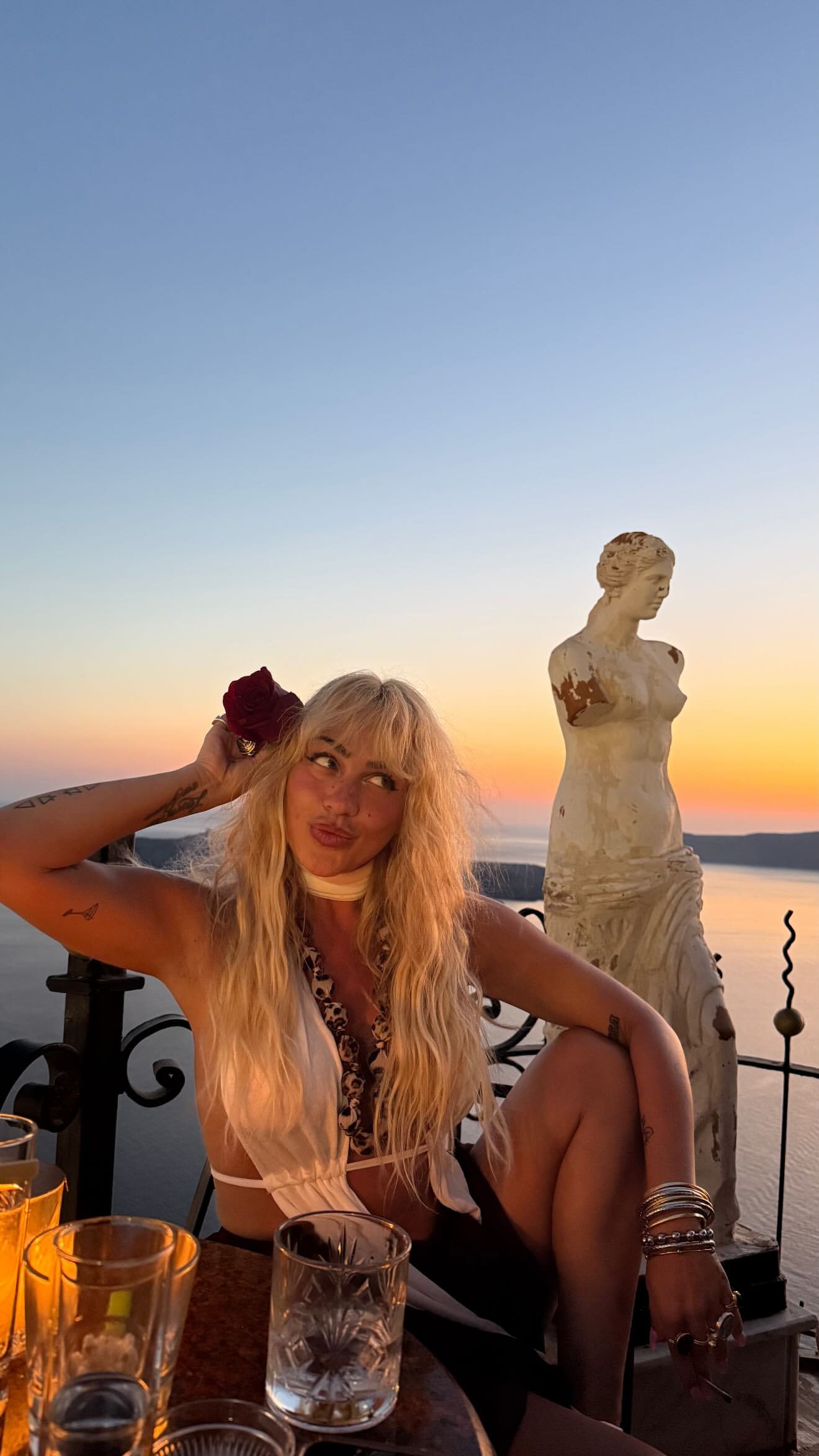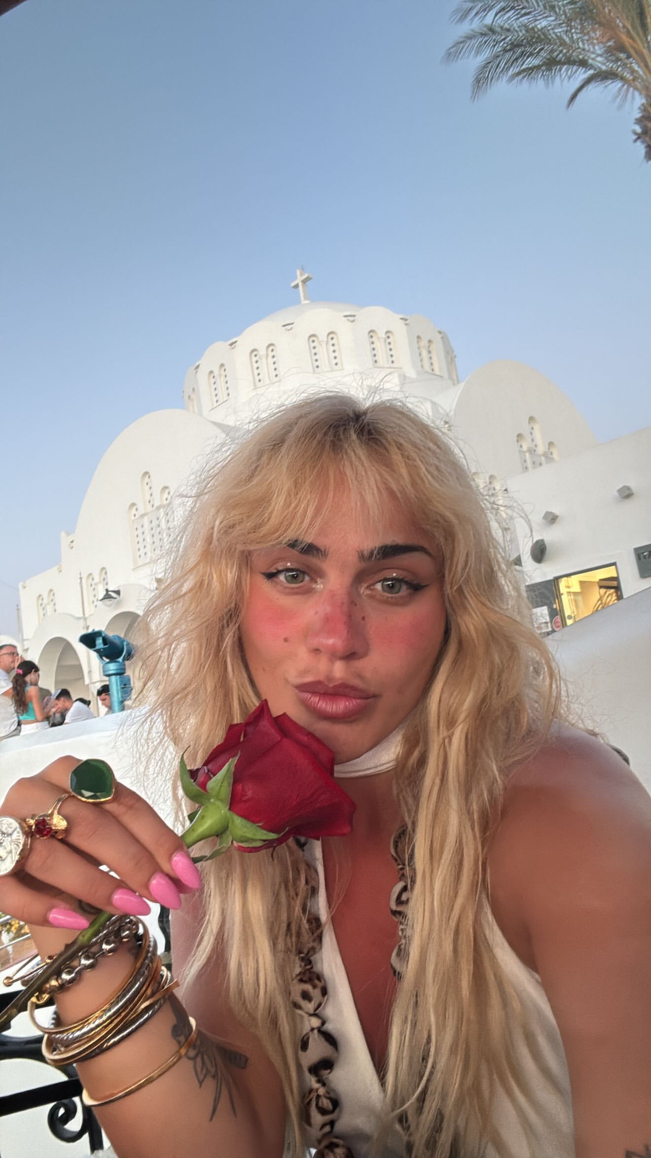 Σε ένα διάλειμμα από τις επαγγελματικές της υποχρεώσεις, η τραγουδίστρια απολαμβάνει τις διακοπές της στη Σαντορίνη, μαζί με την παρέα της.
