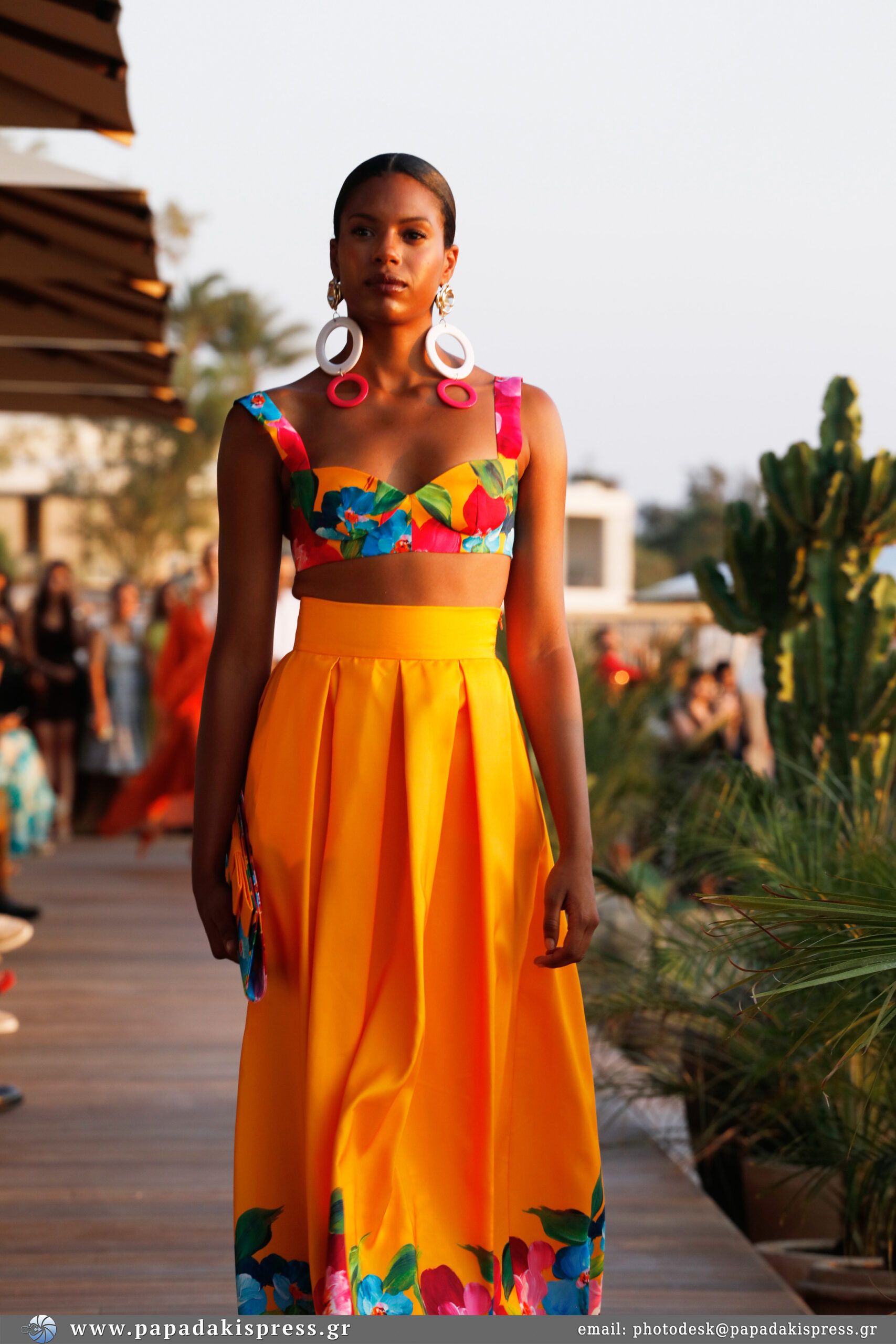 Η συλλογή “Palm Royal” αγκάλιασε το ελληνικό καλοκαίρι μέσα από ανάλαφρα υφάσματα, παστέλ vichy καρό, έντονα εμπριμέ και μεταξωτά maxi φορέματα. Το styling συμπλήρωσαν εντυπωσιακά κοσμήματα από τον Περικλή Κονδυλάτο, μαγιό της Valentina Vasilatou και χειροποίητες raffia τσάντες της Georgia Xanthopoulou.