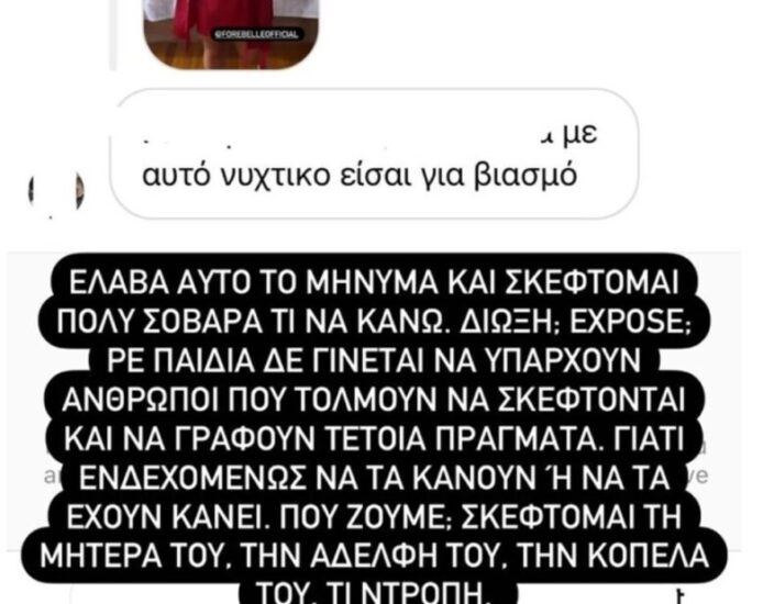 Σοκαρισμένη η δημοσιογράφος κοινοποίησε σε επόμενο Insta-story τη χυδαία απάντηση που έλαβε. Ζήτησε τη γνώμη των followers της για το πώς θα έπρεπε να κινηθεί απέναντι στον συγκεκριμένο χρήστη.