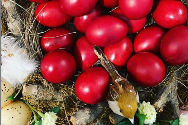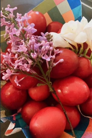 H Τζένη Μπαλαντσινού έβαψε τα αυγά της κόκκινα όπως και η Μαρία Μπεκατώρου που επέλεξε την κλασική εκδοχή, τα έβαψε κατακόκκινα και τα στόλισε με μία πασχαλιά.