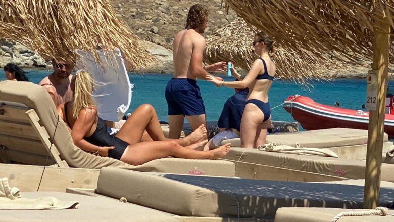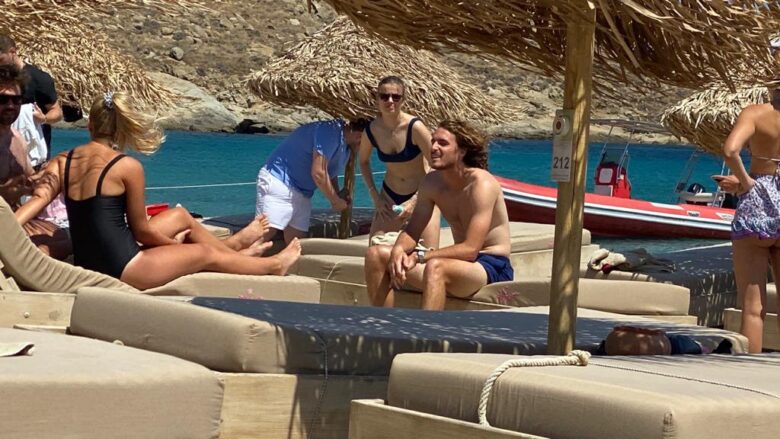 Φιλοξενούμενος στη βίλα Lilium των Beauchamp Estates περνάει υπέροχα. Ο φακός μας τον εντόπισε στην παραλία Λιά. Εκεί συνάντησε και φιλικά του πρόσωπα, μεταξύ των οποίων και τον επιχειρηματία, Κώστα Μαστοράκη.