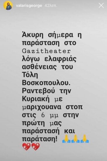 Ο γνωστός καλλιτέχνης αναρρώνει στο σπίτι του, έπειτα από την περιπέτεια υγείας που πέρασε και η οποία οδήγησε και στην ακύρωση της παράστασης «Μαριχουάνα Stop!», για την οποία ενημέρωσε με ανάρτησή του στο διαδίκτυο ο σκηνοθέτης της Γιώργος Βάλαρης.
