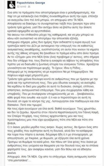 Την ανακοίνωση έκανε ο ίδιος ο δημοσιογράφος με ανάρτησή του στο facebook, όπου με ένα μήνυμά του, γνωστοποιεί την απόφασή του να αποχωρήσει από την ημερήσια εφημερίδα.