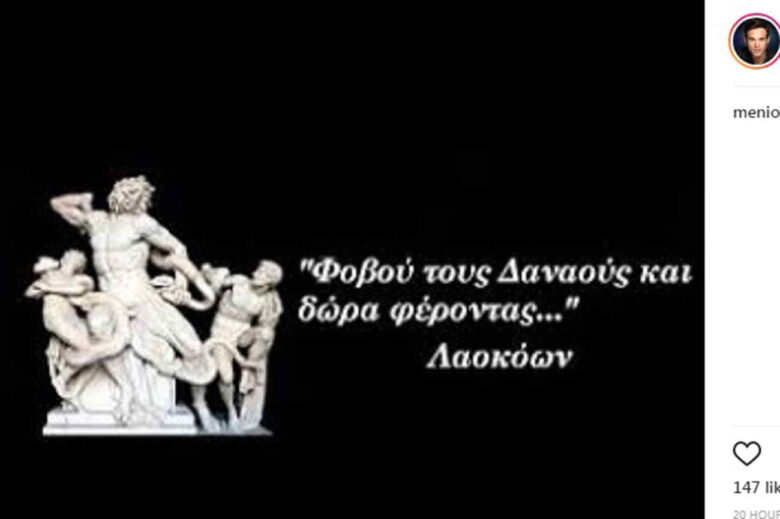 Με ανάρτηση στο Instagram, ο Μένιος σχολίασε τις εξελίξεις αφήνοντας σαφείς υπαινιγμούς και αιχμές για τη διοίκηση του καναλιού. Με μια φωτογραφία του Λαοκόοντα και τη γνωστή του φράση: «φοβού τους Δαναούς και δώρα φέροντας», πολλοί εκτιμούν ότι ο παρουσιαστή θέλησε να στείλει μήνυμα στα στελέχη που έχουν αναλάβει τη διαχείριση του στελεχιακού δυναμικού του Epsilon.