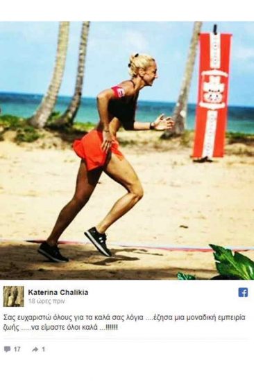 Η Κατερίνα Χαλικιά, λίγες μέρες μετά την αποχώρησή της, ανέβασε στο προφίλ της στο facebook μια φωτογραφία από το παιχνίδι, γράφοντας στη λεζάντα: «Σας ευχαριστώ όλους για τα καλά σας λόγια… Έζησα μια μοναδική εμπειρία ζωής… Να είμαστε όλοι καλά!».