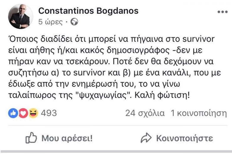 «Όποιος διαδίδει ότι μπορεί να πήγαινα στο survivor είναι αήθης ή/και κακός δημοσιογράφος -δεν με πήραν καν να τσεκάρουν. Ποτέ δεν θα δεχόμουν να συζητήσω α) το survivor και β) με ένα κανάλι, που με έδιωξε από την ενημέρωσή του, το να γίνω ταλαίπωρος της «ψυχαγωγίας». Καλή φώτιση!» έγραψε ο Κωνσταντίνος Μπογδάνος στο Facebook.