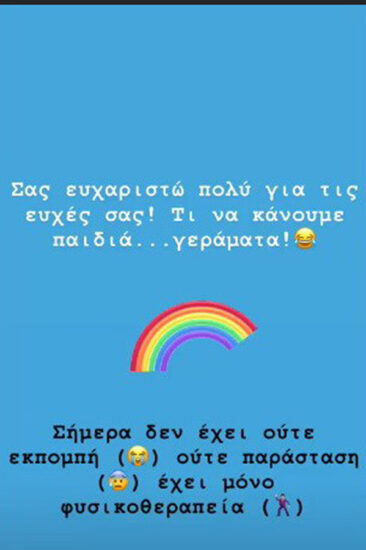 Και επειδή τα μηνύματα συμπαράστασης και οι ευχές για ταχεία ανάρρωση που έλαβε ήταν πολλά, θέλησε να τους ευχαριστήσει όλους με ένα μήνυμα στο Instagram: «Σας ευχαριστώ πολύ για τις ευχές σας. Τι να κάνουμε παιδιά… γεράματα. Σήμερα δεν έχει εκπομπή ούτε παράσταση, έχει μόνο φυσιοθεραπεία».