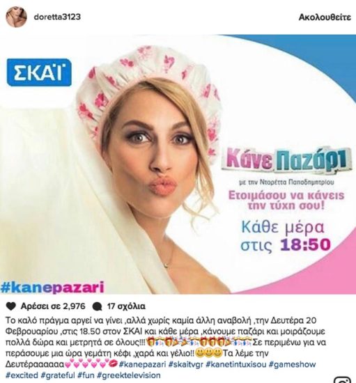 Πιο συγκεκριμένα, το νέο τηλεπαιχνίδι με παρουσιάστρια την Ντορέττα Παπαδημητρίου θα κάνει πρεμιέρα την Δευτέρα 20 Φεβρουαρίου 2017 στις 18:50, όπως μας ενημέρωσε μέσω Instagram η παρουσιάστρια του ΣΚΑΪ.