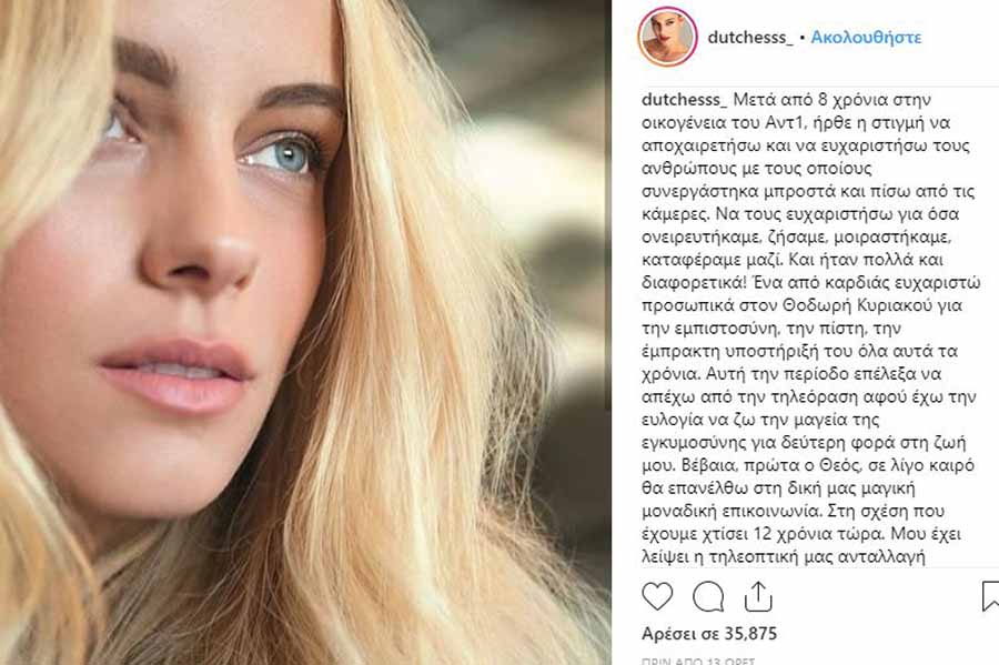 «Μετά από 8 χρόνια στην οικογένεια του ANT1, ήρθε η στιγμή να αποχαιρετήσω και να ευχαριστήσω τους ανθρώπους με τους οποίους συνεργάστηκα μπροστά και πίσω από τις κάμερες.Να τους ευχαριστήσω για όσα ονειρευτήκαμε, ζήσαμε, μοιραστήκαμε, καταφέραμε μαζί. Και ήταν πολλά και διαφορετικά! Ένα από καρδιάς “ευχαριστώ” στον Πρόεδρο του Ομίλου ΑΝΤΕΝΝΑ, Θοδωρή Μ. Κυριακού για την εμπιστοσύνη, την πίστη, την έμπρακτη υποστήριξή του όλα αυτά τα χρόνια. Αυτή την περίοδο επέλεξα να απέχω από την τηλεόραση αφού έχω την ευλογία να ζω την μαγεία της εγκυμοσύνης για δεύτερη φορά στη ζωή μου. Βέβαια, πρώτα ο Θεός, σε λίγο καιρό θα επανέλθω στη δική μας μαγική μοναδική επικοινωνία. Στη σχέση που έχουμε χτίσει 12 χρόνια τώρα. Μου έχει λείψει η τηλεοπτική μας ανταλλαγή ενέργειας και επικοινωνίας. Χαίρομαι όμως που με καταλαβαίνετε, χαίρομαι που με αγαπάτε. Χαίρομαι για τα αμέτρητα υπέροχα καθημερινά μηνύματα σας. Ευχαριστώ για αυτή την τεράστια αγκαλιά αγάπης. Δούκισσα».