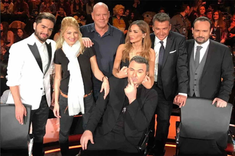 Η Φαίη Σκορδά, στο διάλειμμα του σόου, πόζαρε χαμογελαστή με τους τέσσερις κριτές, τον πρώην σύζυγο της, Γιώργο Λιάγκα και τον Τζώνη Καλημέρη.