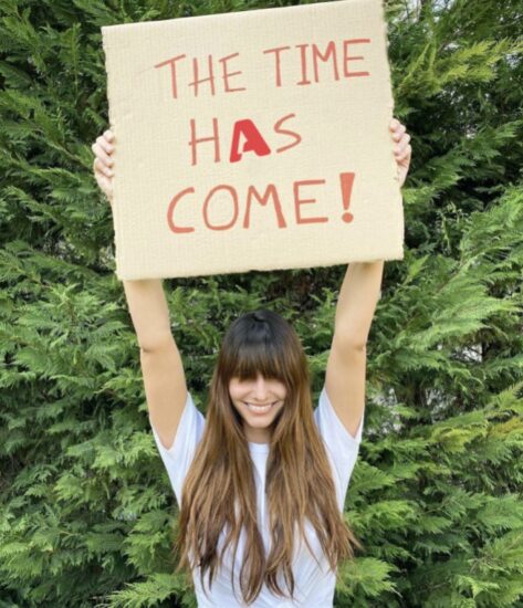 Στην φωτογραφία η Ηλιάνα κρατά ένα ταμπλό στο οποίο αναγράφεται «The time has come». Το A στη λέξη has έχει αντικατασταθεί από το λογότυπο του σταθμού.