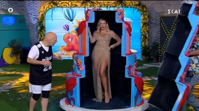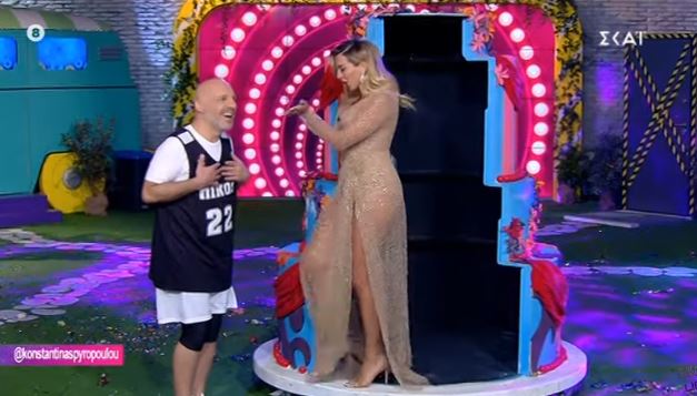 Όταν την άνοιξαν, εμφανίστηκε μια πανέμορφη Κωνσταντίνα Σπυροπούλου, ντυμένη με ένα nude λαμπερό κρουαζέ φόρεμα της Σίλιας Κριθαριώτη.