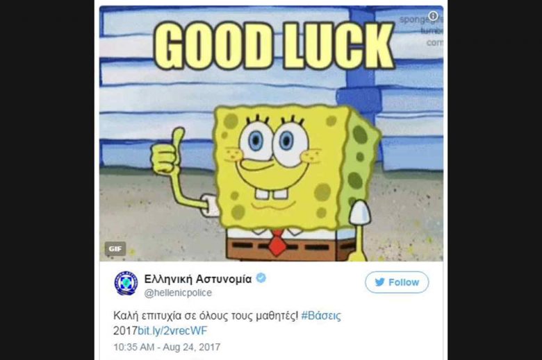 Συγκεκριμένα, στον επίσημο λογαριασμό της Ελληνικής Αστυνομίας στο twitter ανέβηκε ένα GIF, στο οποίο απεικονίζονταν ο Μπομπ ο Σφουγγαράκης-ο αγαπημένος ήρωας μικρών και μεγάλων-να στέλνει καλή επιτυχία στους μαθητές.