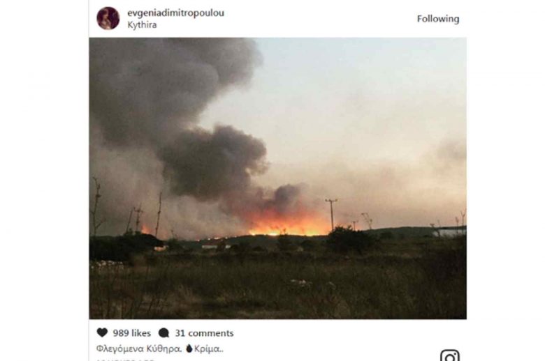 Η ηθοποιός κατέγραψε με το κινητό της την φωτιά, που είχε ξεσπάσει λίγα μέτρα από την περιοχή που διέμενε, γράφοντας στη λεζάντα της φωτογραφίας «Φλεγόμενα Κύθηρα. Κρίμα..».