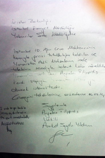 Ο Άγγελος Φιλιππίδης έδωσε στη δημοσιότητα έγγραφο που υποστηρίζει ότι έδωσε στις τουρκικές αρχές στο οποίο διατυπώνει την επιθυμία του να γυρίσει στην Ελλάδα σε ένα σημείο κάτω αριστερά…