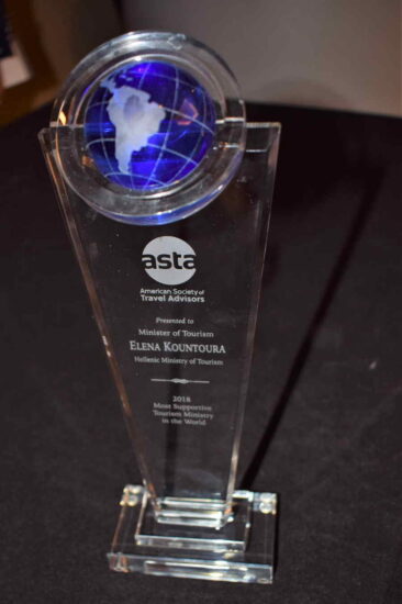 Το βραβείο “The Most Supportive Τourism Ministry in the World 2018 ” παρέδωσαν στην Ελληνίδα Υπουργό ο πρόεδρος της ASTA κ. Zane Kerby και ο αντιπρόεδρος της ASTA, κ. Bob Duglin.
