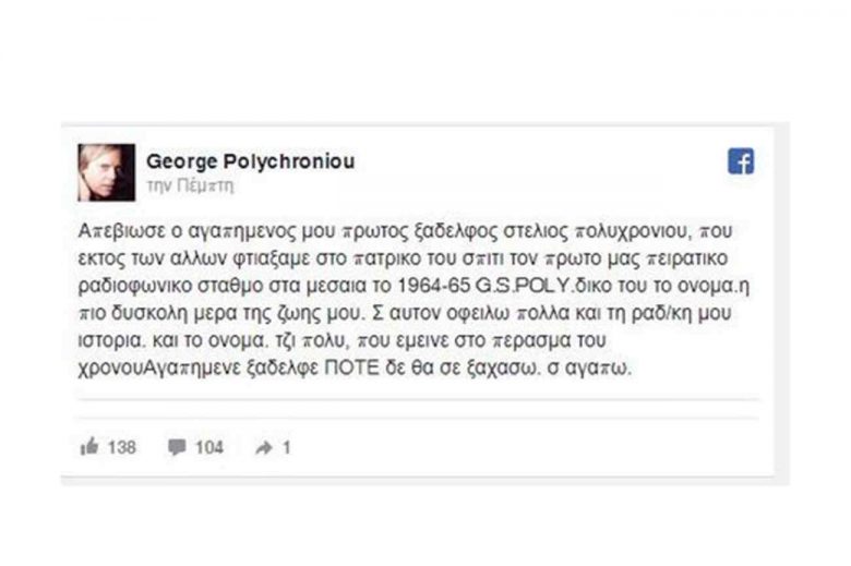 «Aπεβιωσε ο αγαπημενος μου πρωτος ξαδελφος Στελιος Πολυχρονιου, που εκτος των αλλων φτιαξαμε στο πατρικο του σπιτι τον πρωτο μας πειρατικο ραδιοφωνικο σταθμο στα μεσαια το 1964-65 G.S.POLY. δικο του το ονομα. η πιο δυσκολη μερα της ζωης μου. Σ αυτον οφειλω πολλα και τη ραδ/κη μου ιστορια. και το ονομα. τζι πολυ, που εμεινε στο περασμα του χρονου Αγαπημενε ξαδελφε ΠΟΤΕ δε θα σε ξαχασω. σ αγαπω» εγραψε ο γνωστός ραδιοφωνικός παραγωγός και παρουσιαστής στη σελίδα του στο facebook, αποχαιρετώντας για πάντα το μέντορα και ξάδελφό του.