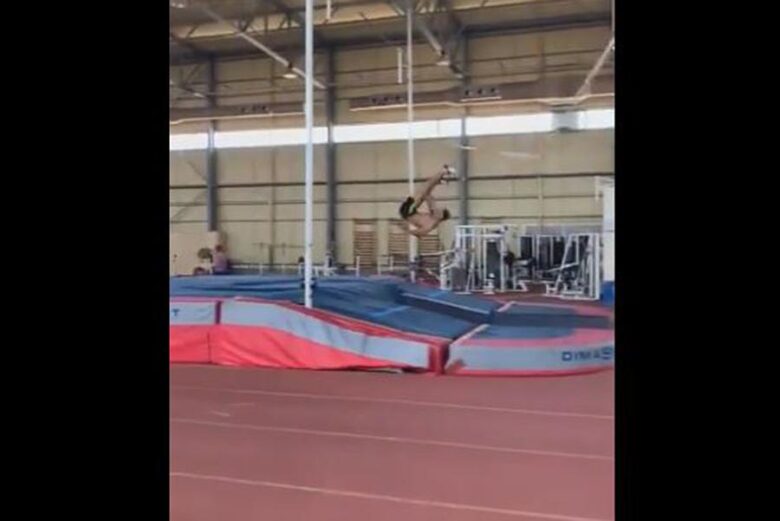 Σοκάρει η στιγμή του ατυχήματος που είχε ο Εμμανούλ Καραλής, όταν έσπασε το κοντάρι του ενώ επιχειρούσε άλμα κατά τη διάρκεια της προπόνησης.
