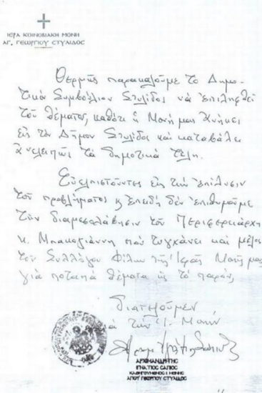 Με χειρόγραφό του, ο αρχιμανδρίτης Ιγνάτιος Σάπιος ζήτησε να περνάει το απορριμματοφόρο από τη μονή, γράφοντας πως ελπίζει να ικανοποιηθεί το αίτημά του, ώστε να μη χρειαστεί να απευθυνθεί στον περιφερειάρχη Κώστα Μπακογιάννη.