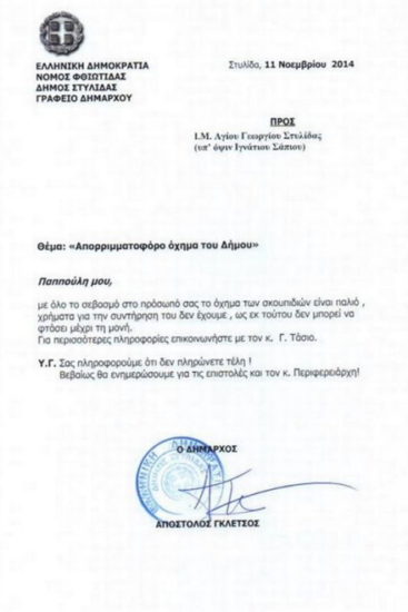 Με την προσφώνηση «Παππούλη μου…» απάντησε ο δήμαρχος Στυλίδας Απόστολος Γκλέτσος στο αίτημα του αρχιμανδρίτη Στυλίδας να περνάει το απορριματοφόρο του δήμου από την Ιερά Μονή, αν και δεν πληρώνει δημοτικά τέλη.