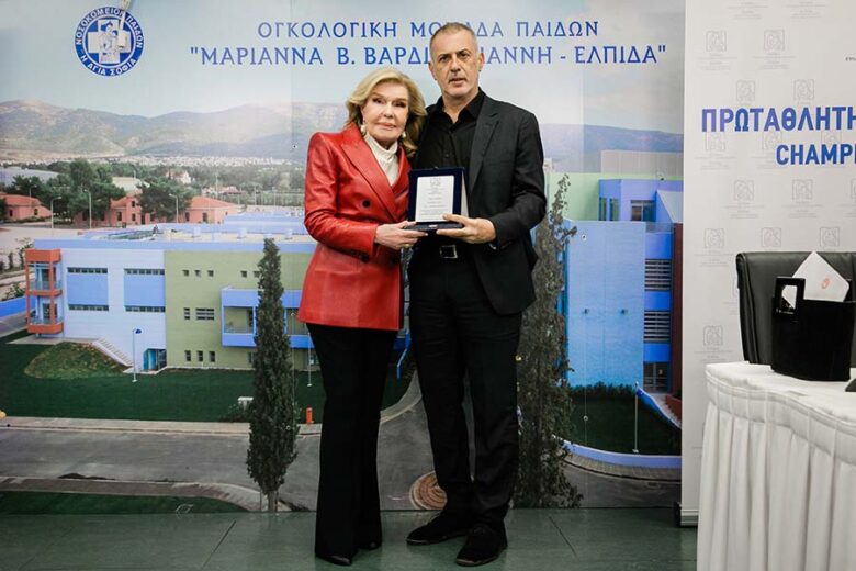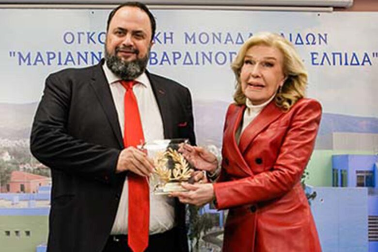 Αμέσως μετά ο κύριος Μαρινάκης παρέδωσε για ακόμα μια χρονιά στην κυρία Βαρδινογιάννη μια επιταγή για την στήριξη του έργου της Ογκολογικής Μονάδας Παίδων. Η κυρία Βαρδινογιάννη, από την πλευρά της, σε αναγνώριση της μεγάλης στήριξης της Π.Α.Ε. Ολυμπιακός, και προσωπικά του Βαγγέλη Μαρινάκη, του προσέφερε ένα στεφάνι ελιάς θέλοντας με αυτό τον συμβολικό τρόπο να τον τιμήσει για τη σημαντική συμβολή του στο έργο του Συλλόγου ΕΛΠΙΔΑ.