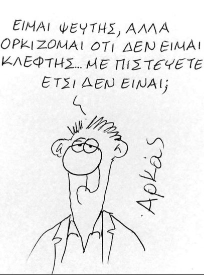 Με αρκετή δόση χιούμορ και θέλοντας να κάνει και το πολιτικό του σχόλιο, ο κ. Μητσοτάκης είπε πως σκέφτεται να στείλει στον πρωθυπουργό για δώρο μια κορνίζα με τη γελοιογραφία του Αρκά στην όποια γίνεται έμμεση αναφορά στον Αλέξη Τσίπρα με ένα πρόσωπο να λέει:: «είμαι ψεύτης αλλά ορκίζομαι ότι δεν είμαι κλέφτης, με πιστεύετε;».