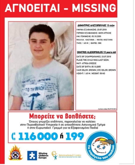 Σήμερα ταυτοποιήθηκε η σορός του 13χρονου Δημήτρη Αλεξόπουλου, για τον οποίο το Χαμόγελο του Παιδιού εξέδωσε Missing alert, καθώς αγνοείται από τις 23 Ιουλίου μετά την πυρκαγιά στο Μάτι. Τα ίχνη του παιδιού είχαν χαθεί ενώ ήταν μαζί με τον θείο, τον παππού και τη γιαγιά του.