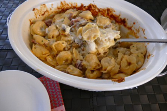 Βάζουμε σε ένα βουτυρωμένο πυρίμαχο σκεύος, τα τορτελίνια κι όλα τα υπόλοιπα υλικά (εκτός από την κρέμα γάλακτος) κι ανακατεύουμε καλά. Περιχύνουμε με την κρέμα γάλακτος και ψήνουμε σε προθερμασμένο, στους 180 βαθμούς, φούρνο για 20′-25′ ανακατεύοντας κάθε περίπου 8′ για να μην σχηματιστεί κρούστα.