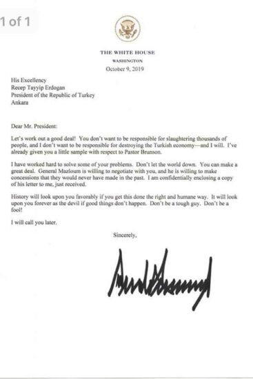 Τρανή απόδειξη, η επιστολή που απέστειλε στον Ταγίπ Ερντογάν μετά την τηλεφωνική τους επικοινωνία και την έφοδο των Τουρκικών δυνάμεων στη Συρία. Την επιστολή εξασφάλισε η δημοσιογράφος του καναλιού FOX, Trish Regan και η αυθεντικότητά του έχει ήδη επιβεβαιωθεί από τον Λευκό Οίκο. Σε αυτή, ο Ντόναλντ Τραμπ απευθύνεται στον Τούρκο ομόλογό του σα να μιλά στον κολλητό του, ενώ οι εκφράσεις και η γλώσσα που χρησιμοποιεί, μόνο ύφος επίσημου εγγράφου, δεν καταδεικνύει.